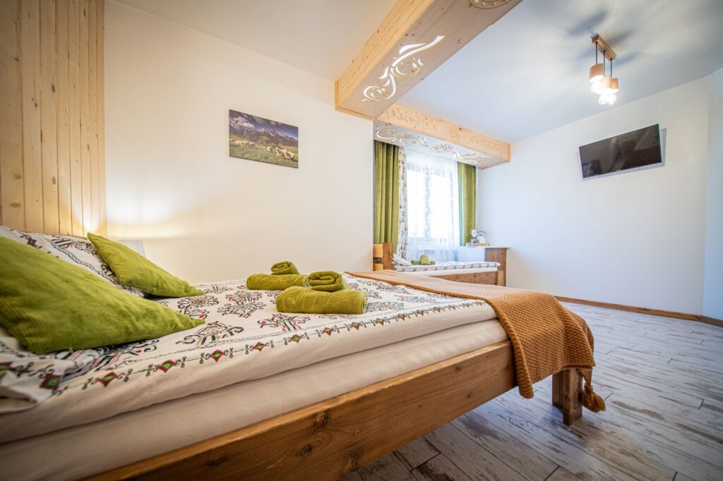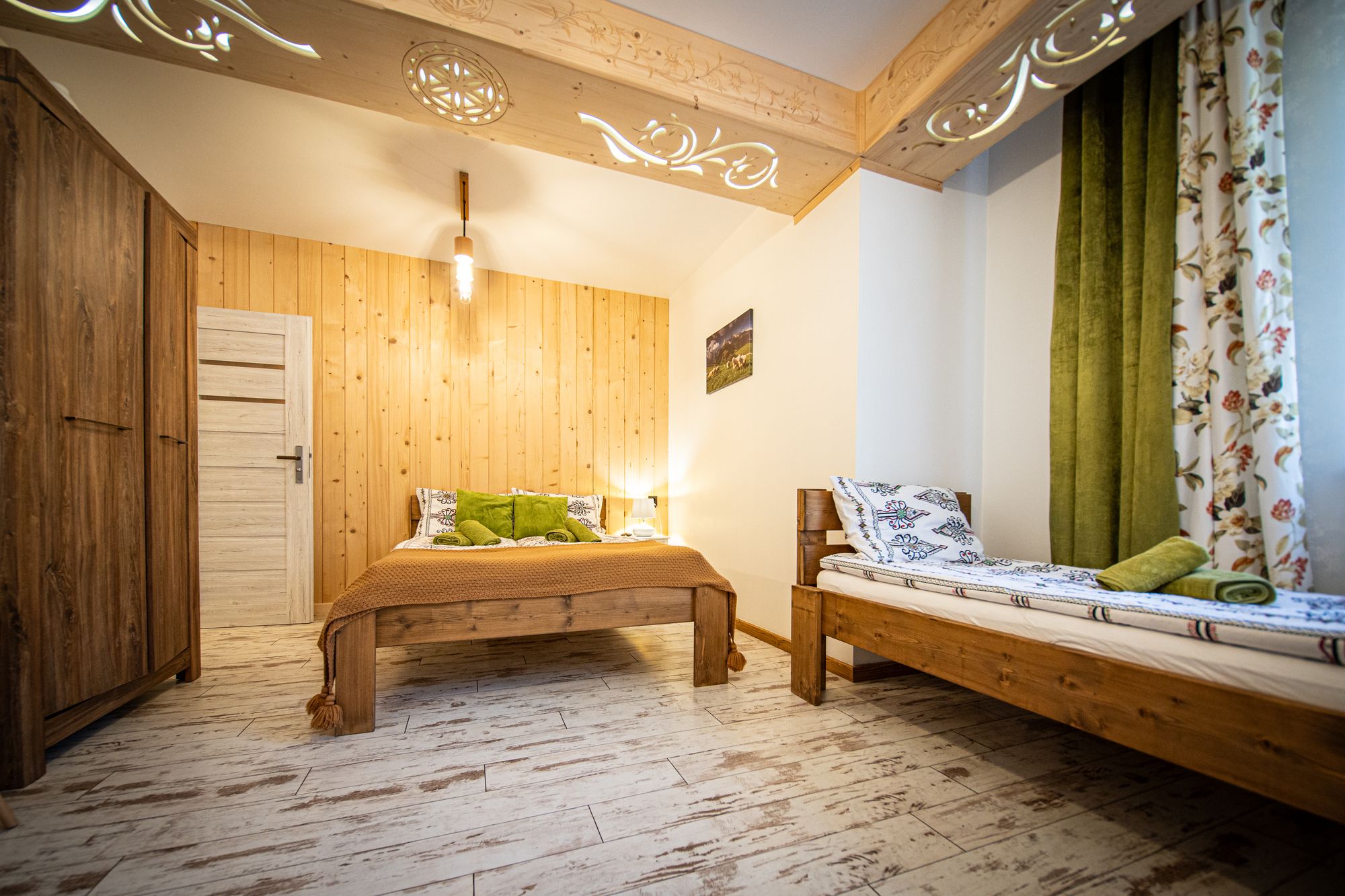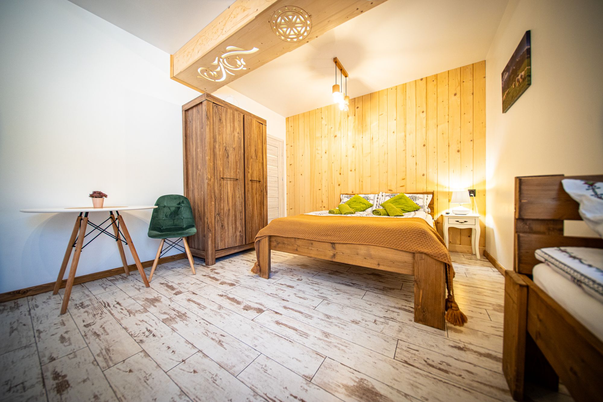 Naturalne drewno, ozdobne rzeźbienia i detale nawiązujące do regionalnej estetyki tworzą ciepłą, góralską atmosferę. Pokój idealny dla rodziny z dzieckiem lub grupy przyjaciół.